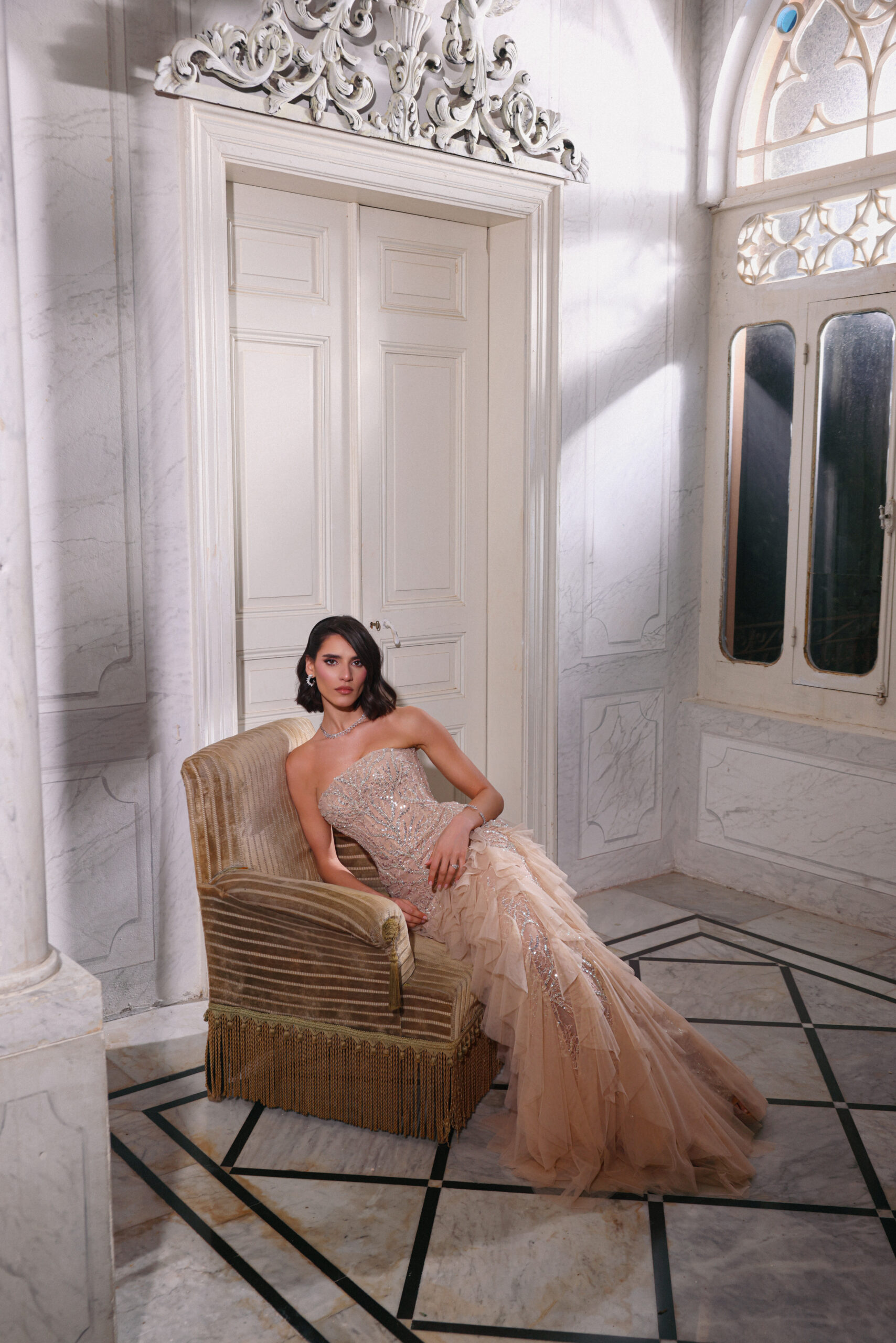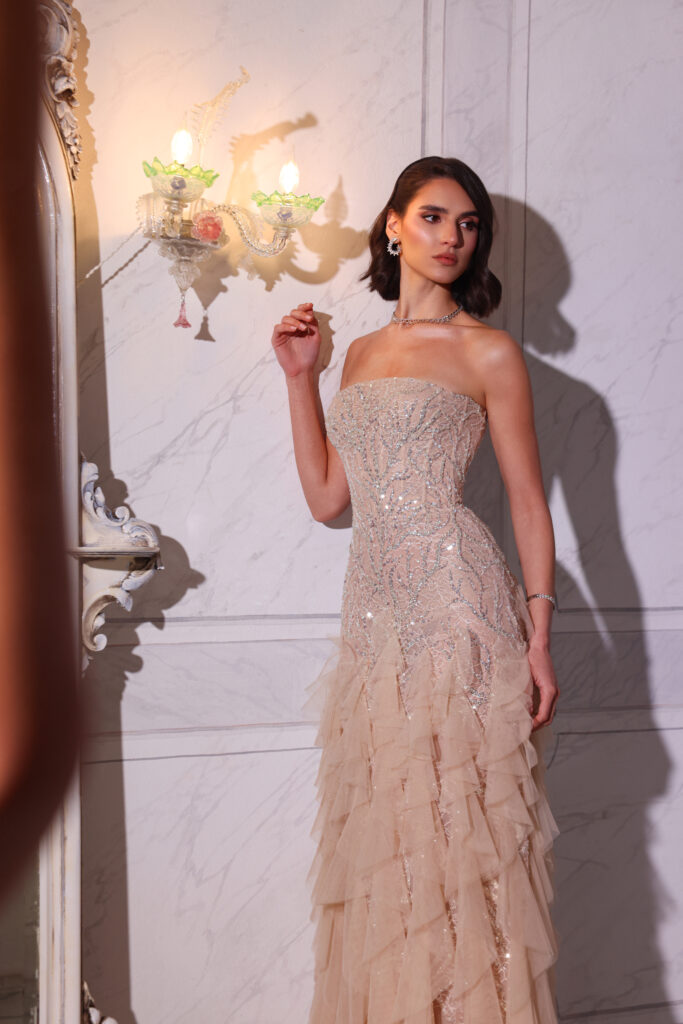Style: Semi-Embellished, Upper Cut: Strapless, Lower Cut: A-line, Length: Maxi, Fabric: Embellished, Tulle