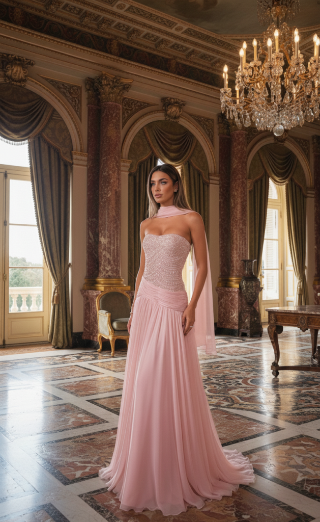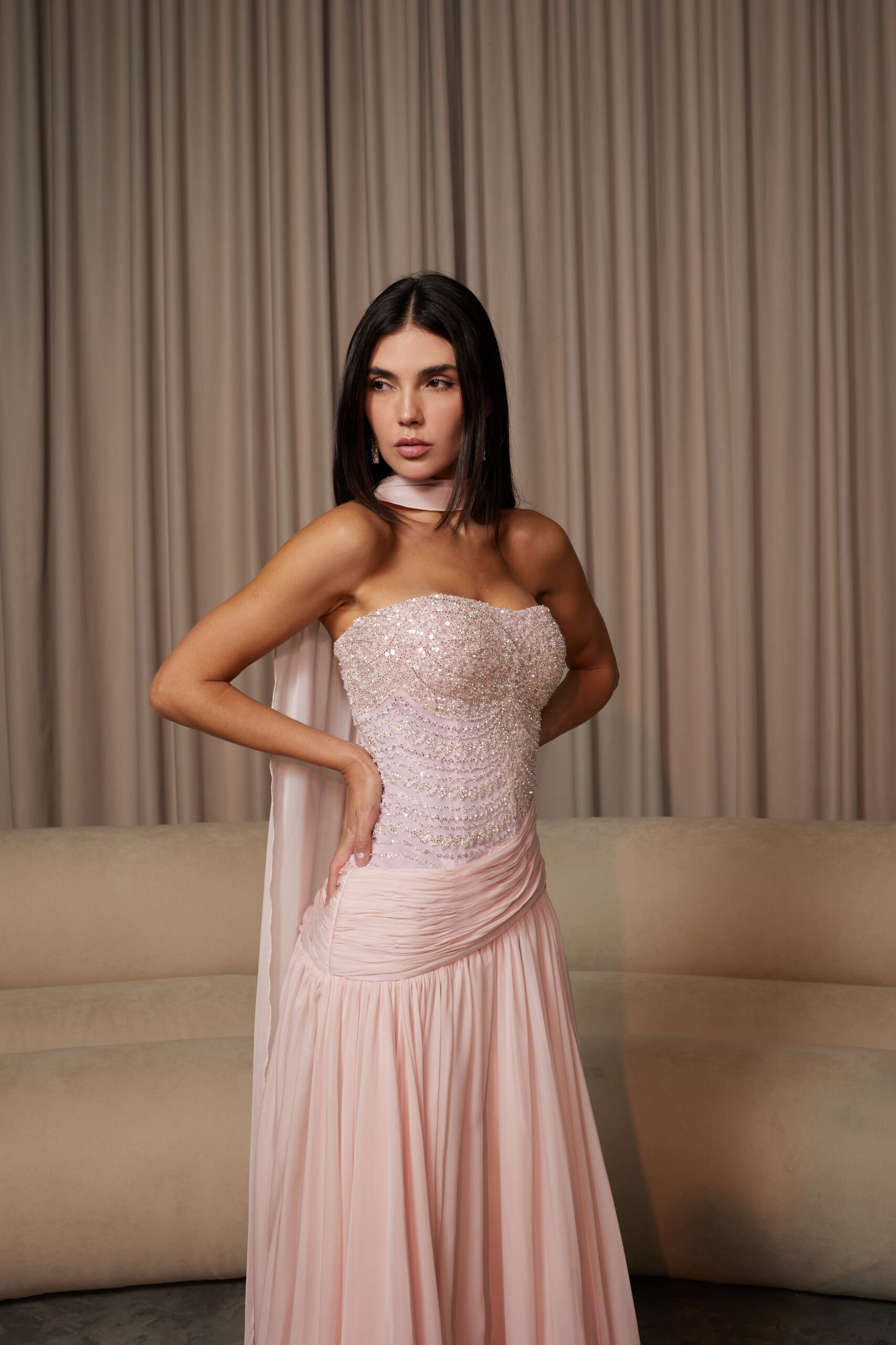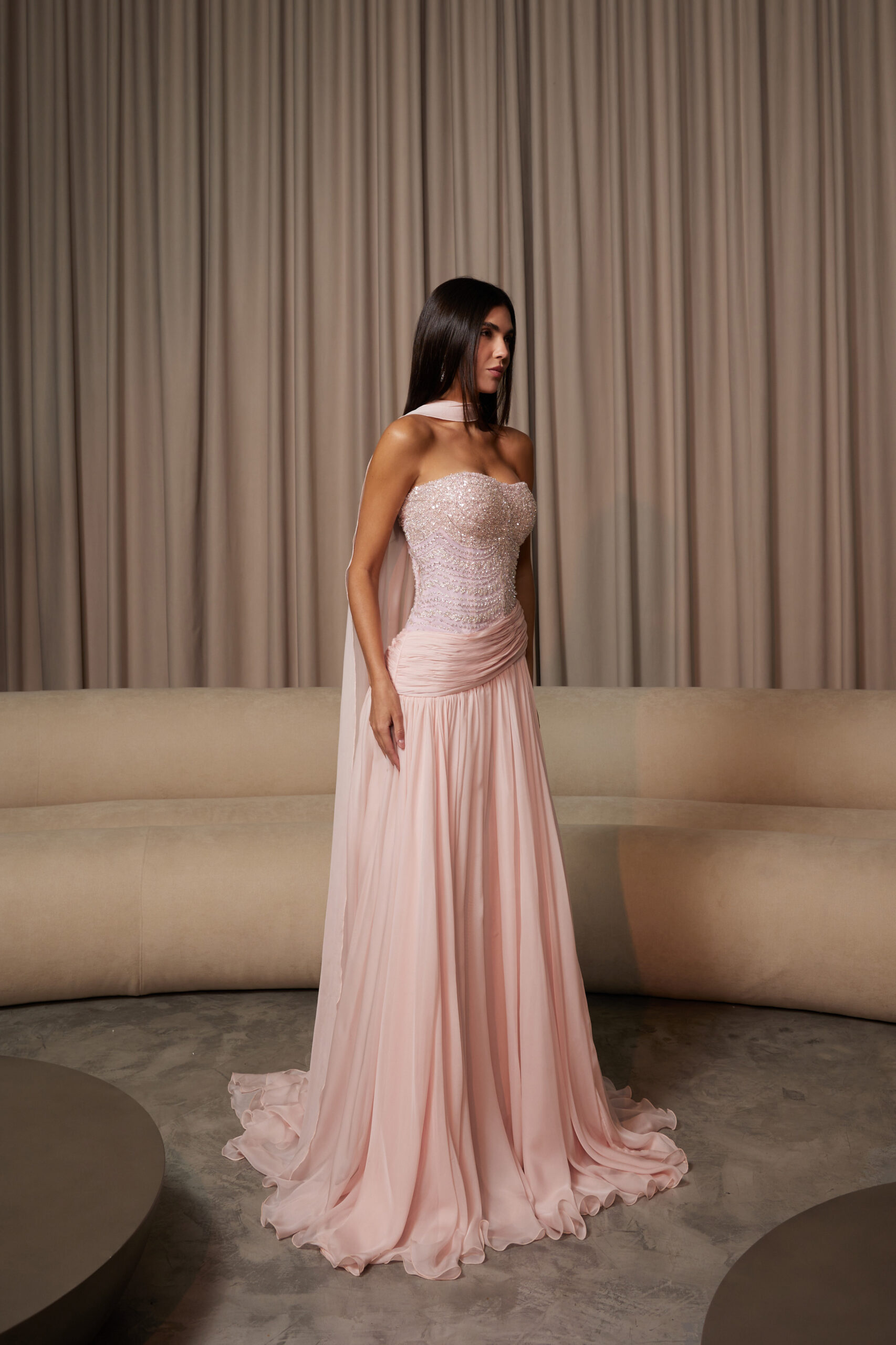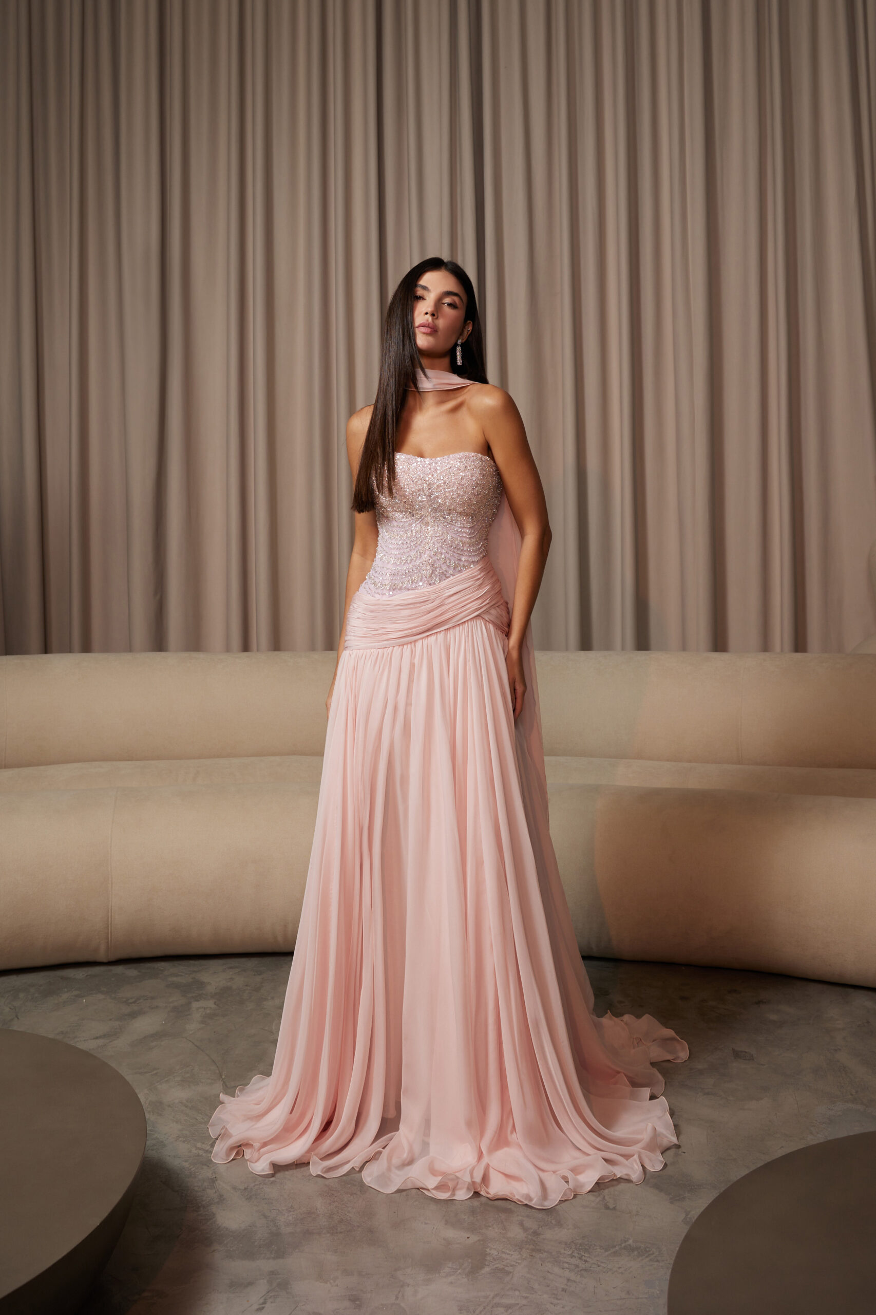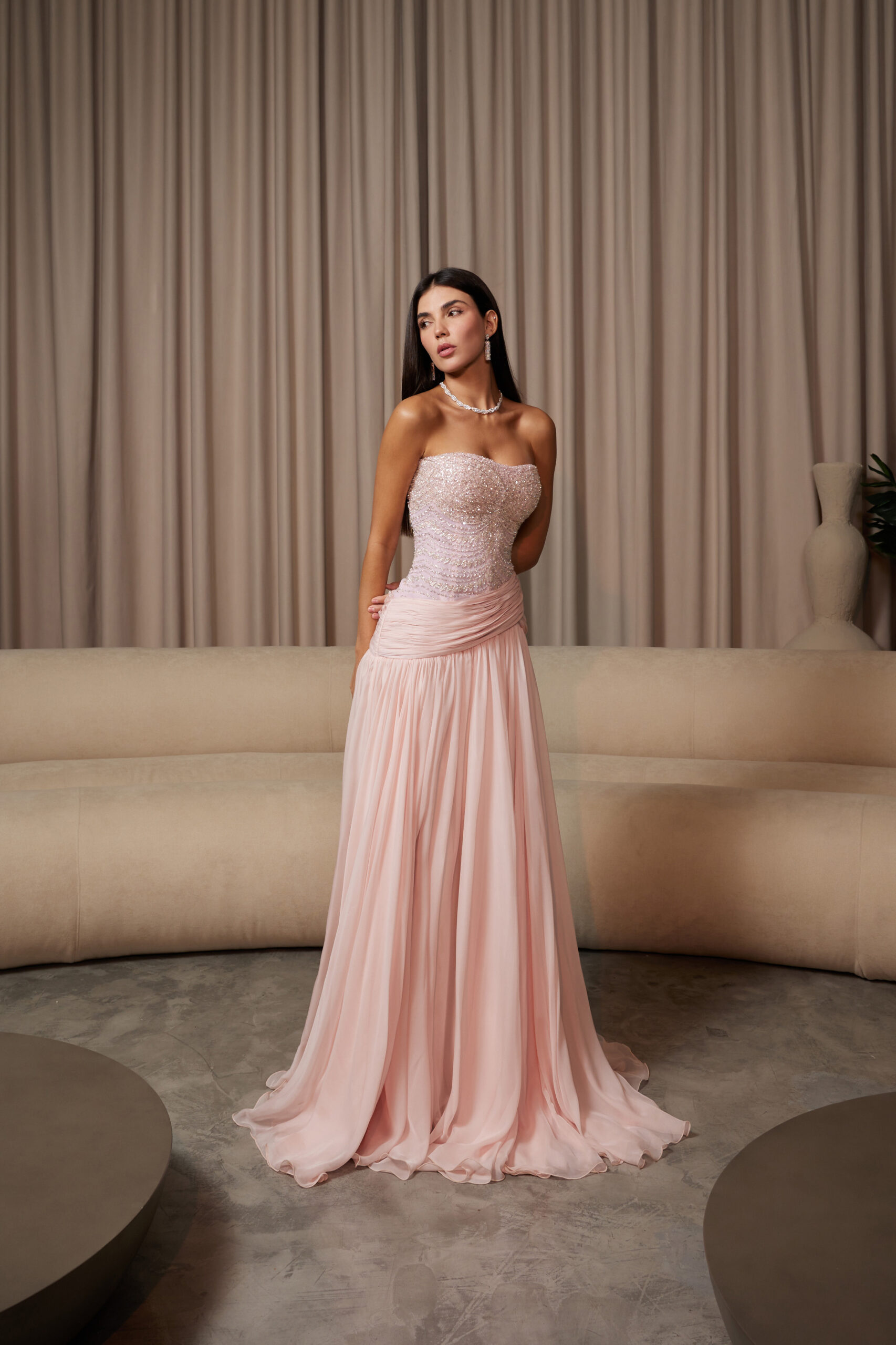 Style: Simple, Upper Cut: Corset, Off-shoulders, Lower Cut: Flowy, Length: Maxi, Fabric: Chiffon