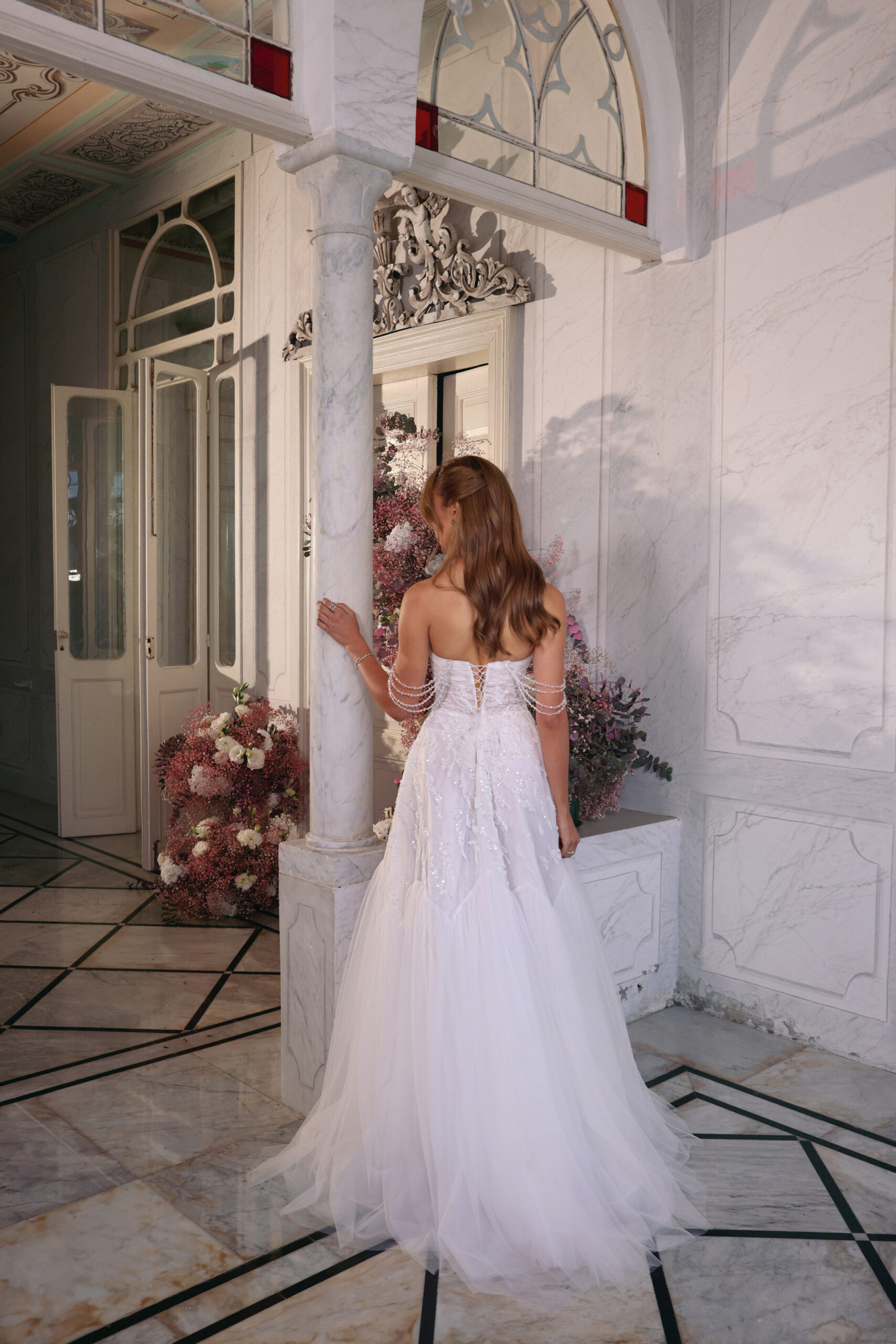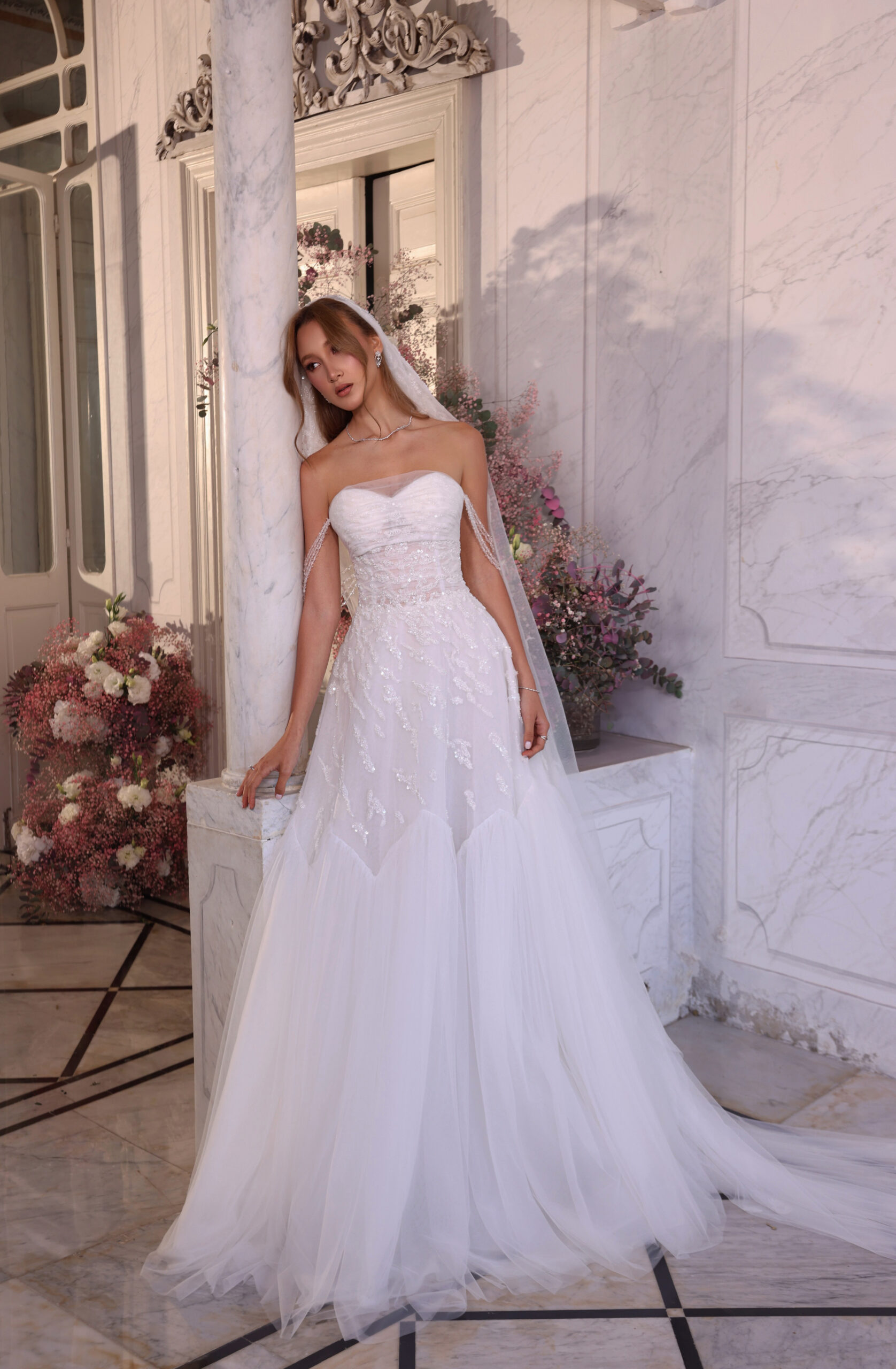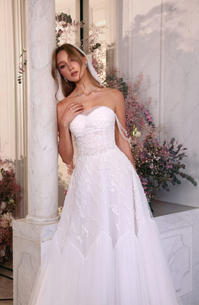 Style: Semi-Embellished, Upper Cut: Strapless, Lower Cut: A-line, Length: Maxi, Fabric: Embellished, Tulle