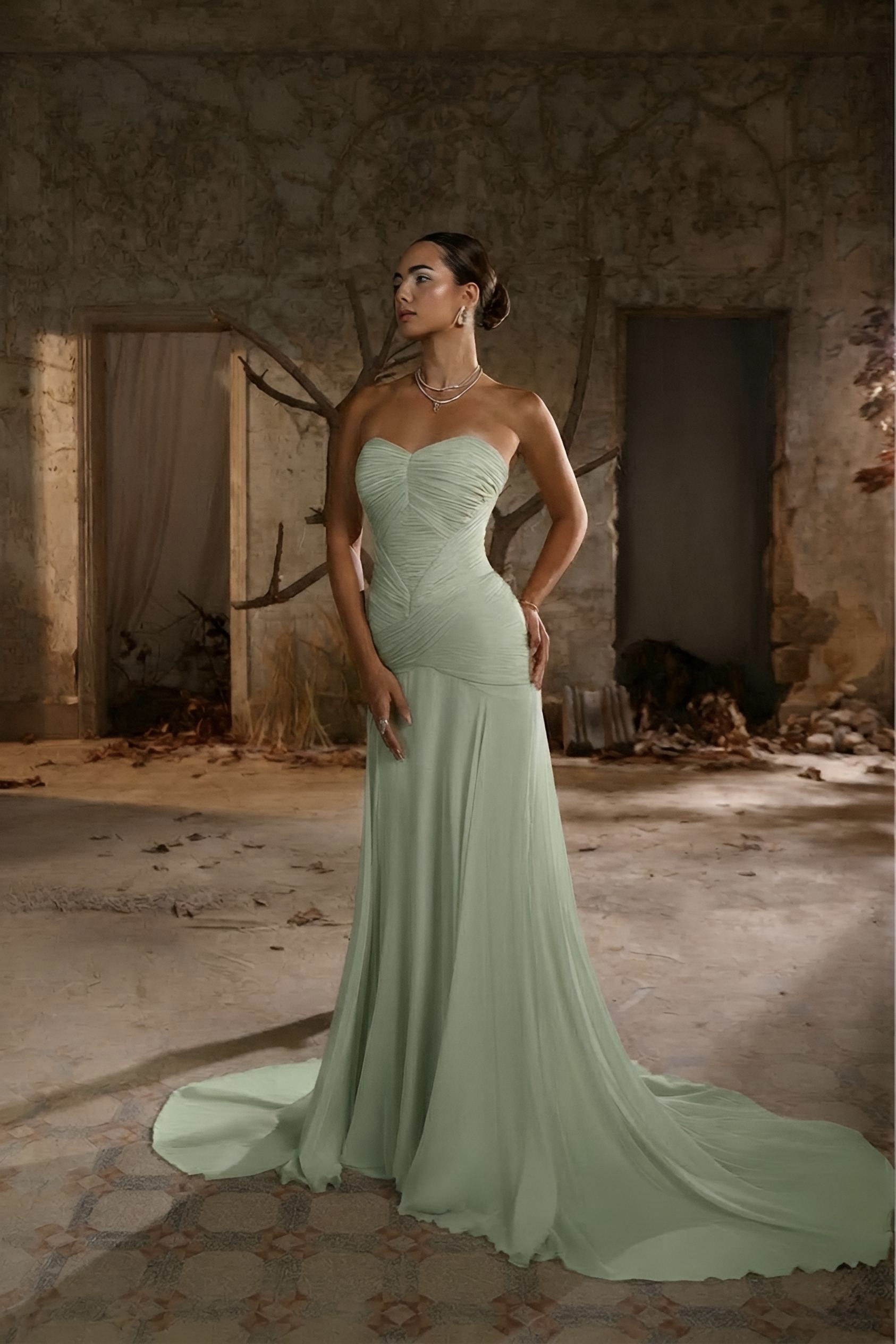 Style: Simple, Upper Cut: Corset, Strapless, Lower Cut: Fitted, Flowy, Length: Maxi, Fabric: Chiffon